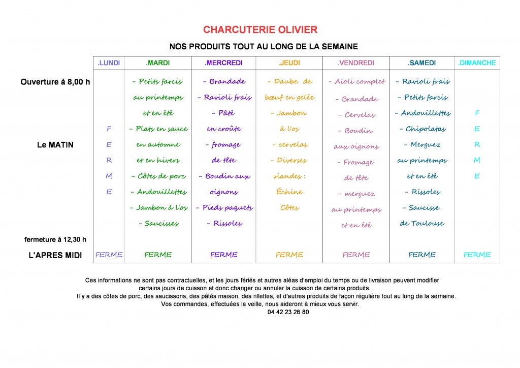 Afin de conserver à nos produits un goût authentique, nous privilégions leur qualité plutôt que leur quantité, c’est la raison pour laquelle nous ne sommes ouverts que le matin, et qu’il n’y a pas de « tout » tous les jours.