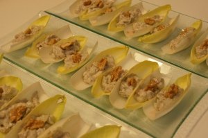 Laver et sécher les endives effeuillées. Garder les plus grosses et belles pour qu’elles servent de barquettes. Couper les cœurs restants en tous petits morceaux. Couper le jambon en tous petits dés. Mixer très finement environ 70 gr de noix jusqu’à les réduire en poudre. Écraser le roquefort à l’aide d’une fourchette pour commercer à le ramollir, puis le mélanger à la poudre de noix, et « délayer » le tout avec un peu d’huile de noix et de crème fraîche, selon la consistance souhaitée : assez crémeuse mais pas liquide. (j’utilise un mixeur pour obtenir une crème la plus lisse possible.) Mélanger la crème obtenue avec les dés de jambon et les morceaux d’endives. Rectifier l’assaisonnement en sel et poivre selon votre goût, mais attention le jambon et le roquefort sont déjà salés ! En farcir les barquettes d’endives et les décorer d’un 1/2 cerneau de noix. Servir bien frais.