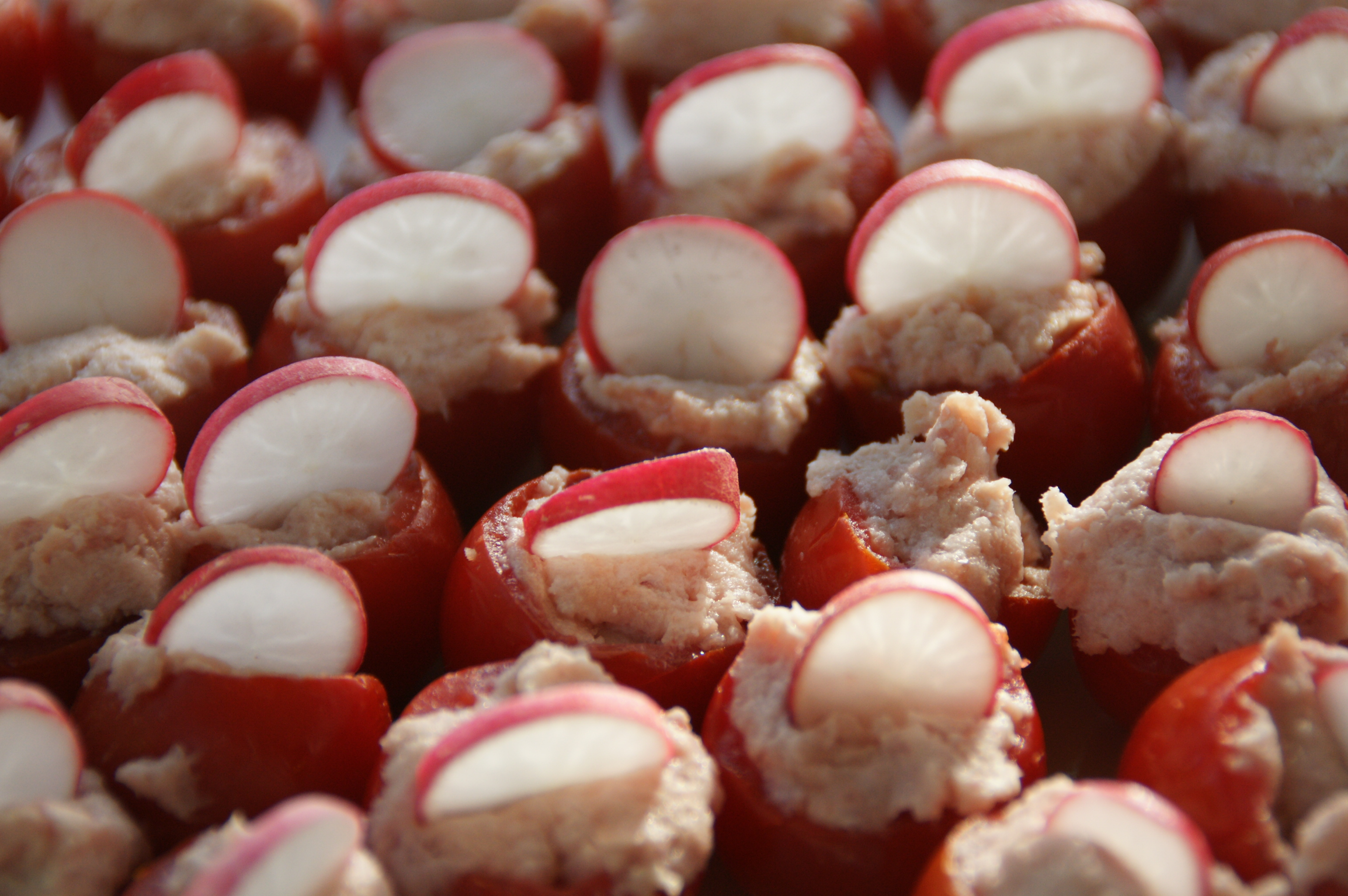 Garnir les tomates du mélange jambon/mascarpone/radis, et déposer une tranche sur le dessus pour la déco. Servir bien frais.