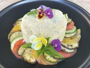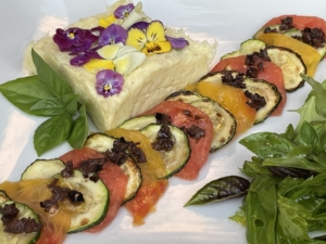 Tasser la brandade dans un emporte-pièce, présenter tous les éléments selon votre convenance, en ajoutant des fleurs comestibles ici ou là.
