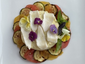 Trancher finement la courgette, et faire revenir les tranches dans un peu d’huile d’olive. Laisser absorber le surplus d’huile en déposant les tranches fines sur du papier sopalin. les saler très légèrement.