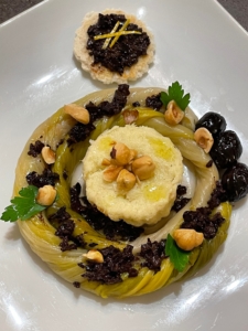 Créer une vinaigrette : vinaigre balsamique, huile de noisette, sel, poivre et hachis d’olives noires. Réserver.