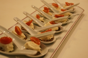 Au moment de servir, mettre une noisette de sauce aux olives au fond des cuillères, poser dessus une quenelle de brandade (que je fais à l’aide de 2 cuillères à moka), puis déposer un quart de tomate cerise sur le dessus.