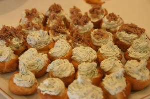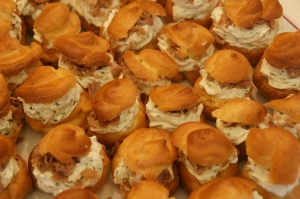 Découper les couvercles des choux refroidis. A l’aide d’une poche à douille garnir les choux de crème, parsemer la surface du reste de pancetta, et couvrir des chapeaux. Servir frais 🙂