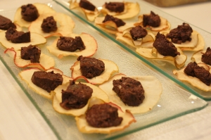 Réalisation : Préchauffer le four à 80° C. Éliminer le cœur des pommes à l’aide d’un vide pomme, puis les découper en tranches de 2 à 3 mm d’épaisseur à la mandoline. Tremper chaque tranche dans le jus de citron pour éviter qu’elle ne noircisse. Mettre du papier sulfurisé sur la plaque du four et y étaler les tranches de pommes de manière à ce qu’elles ne se touchent pas. Les saupoudrer de sucre ou de sel selon votre goût, et les enfourner pendant au moins 2 h. Les laisser refroidir. Enlever la peau du boudin sans le chauffer, le couper en tronçon d’un petit centimètre d’épaisseur. Pour « solidifier » les chips j’en superpose deux l’une sur l’autre, puis je mets un petit morceau de boudin. Ces toasts se servent froids.
