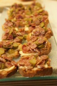Réalisation : Coupez très finement les saucissons et les cornichons et mélangez les bien. Tartinez le beurre sur les tranches grillées. Installez des petits tas du mélange « saucissons/cornichons » , et servez …. (Une idée de Benoît)