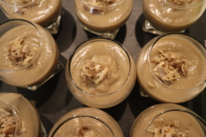 Faire griller les 3 fines tranches de petit salé dans une poêle et lorsqu’elles sont bien grillées, les effriter pour en mettre une pincée sur le centre de la verrine.