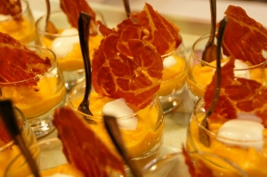 Pendant ce temps préchauffer le four à 190° C. Couvrir une plaque de four d’un papier sulfurisé. Installer les tranches de jambon cru (du San Danièle sur la photo) sans qu’elles ne se touchent. Les couvrir d’un autre papier sulfurisé, et recouvrir le tout d’une autre plaque de four (ou d’un plat à pizza, ou d’un plat à gratin vide, c’est juste pour faire du poids et garder les tranches bien plates). Les enfourner 15 minutes. A la sortie du four, enlever la « plaque poids » ainsi que le papier sulfurisé pour laisser refroidir les chips de jambon cru. Attention, elles deviennent extrêmement fragiles et cassantes. Au moment de servir, réchauffer le velouté de potimarron, et en répartir dans les verrines selon votre envie. Déposer une larme de crème fraîche froide, et planter la chips de jambon cru. (voir la photo)