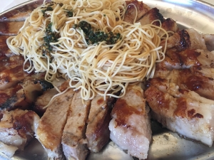 Verser les nouilles égouttées dans le plat de cuisson des côtes pour qu’elles s’imbibent de la sauce yakitori qui s’est mélangée au gras de cuisson des côtes. Ajouter le mélange ail/soja/huile de sésame/ coriandre, et bien mélanger le tout.