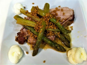 Sur chaque assiette, mettre une tranche de viande, 3 asperges confites recouvrir d’une ou deux cuillères à soupe d’épeautre au jus. Déposer quelques feuilles de roquette de ci, de là. Et ajouter une belle cuillère de crème fouettée à l’orange au dernier moment.