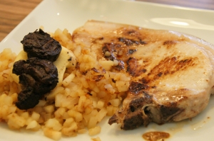 Pendant ce temps, éplucher les deux pommes. Faire deux belles tranches d’un demi centimètre environ pour pouvoir y poser les rondelles de boudin plus tard. Couper le reste des pommes en minuscules dés (après en avoir ôté les pépins), et les mettre à cuire à feu doux dans une sauteuse avec un peu de beurre. Dans une autre poêle, faire dorer les tranches de pomme en essayant de les garder entières, et faire aussi dorer les rondelles de boudin noir, toujours à feu doux.