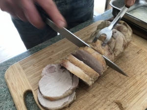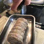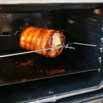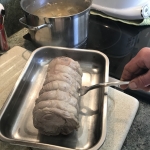 solution la plus simple quand on a la chance d’avoir un four muni d’un tourne-broche. Il suffit d’embrocher le filet roulé, et de l’enfourner à 180°C position « broche tournante » bien sûr. En général j’évalue le temps de cuisson à 50 minutes par kilogramme de viande. Ensuite, selon l’épaisseur du rôti et le goût de chacun, on peut allonger le temps de cuisson.