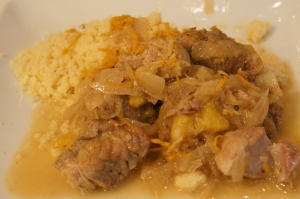 Remettre la viande dans les oignons cuits, ajouter le jus de 4 oranges, et les suprêmes des citrons et des oranges, saler, poivrer, ajouter les graines de cardamome (extraites de leur coquille) et les graines de coriandre après les avoir broyées. Laisser mijoter à feu très doux, environ 1 à 1.30 heures. Ajouter un peu d’eau si le jus semble insuffisant.