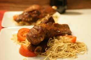 Servir les os cuits sur les nouilles aux tomates et ne pas hésiter à mouiller les nouilles avec le jus restant dans le plat du four.