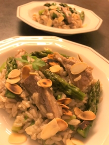Riz aux asperges, grillades aux amandes