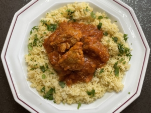 Lorsque la semoule a gonflé, j’ajoute des dès de beurre et je l’aère avec une fourchette ou mes doigts.