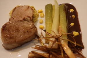 Dresser dans les assiettes : un peu de condiment au maïs, les poireaux, une à deux tranches de filet mignon par assiette, la « sauce au chocolat » et ne pas oublier la julienne de poireaux grillées. Présenter à votre convenance, ou inspirez vous de la photo (j’ai gardé quelques grains de maïs pour la déco) et servir le plus chaud possible.