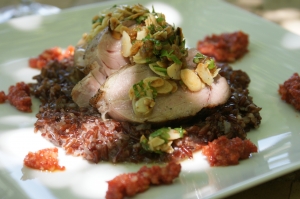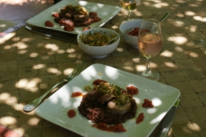 Ensuite, ciseler finement la coriandre fraîche, et la mélanger avec les amandes effilées, la coriandre en grain et les figues sèches (coupées en tous petits morceaux, elles font le pendant de la « violence » de l’harissa). Arroser du jus d’un citron jaune et d’une petite rasade d’huile d’olive.