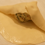 feuille de film alimentaire, ajouter dessus une crêpe, puis une demi tranche de jambon cru, mettre une cuillère à soupe de duxelles de champignons, déposer un morceau de filet mignon après l’avoir légèrement salé et poivré. Refermer le tout fermement avec le film alimentaire pour donner une forme ronde, et laisser reposer au réfrigérateur 3/4 d’heure.