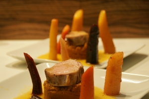 Éplucher et couper toutes les autres carottes colorées. Les couper en 2 ou trois selon leur taille et leur donner la forme que vous souhaitez en pensant à la présentation. Mettre tous ces morceaux de carottes à bouillir dans de l’eau salée…. ça prend une bonne quarantaine de minutes pour qu’elles soient cuites.