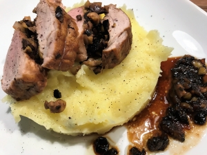 Installer la purée de pommes de terre dans des cercles de présentation, déposer 2 tranches de mignon farcies aux olives dessus, et ajouter une belle cuillère à soupe de jus sur le côté. Ajouter un tour du moulin à poivre.