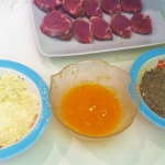 Déposer un médaillon de mignon dans la farine et tapoter pour qu’il n’y en ait pas trop. Puis tremper cette même face dans l’œuf battu un peu salé et poivré, et enfin dans la chapelure de morille. Renouveler l’opération pour tous les médaillons.