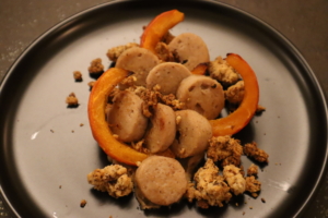 Boudin blanc aux potimarrons grillés , crème de châtaignes et crumble