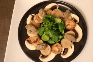 Lorsque tout est cuit et chaud, présenter selon votre envie et servir. (sur la photo avec les potimarrons, la crème de châtaigne est étalée sous les autres ingrédients. Sur la photo avec les champignons j’ai fait des quenelles de crème de châtaignes , je n’ai pas mis de crumble et j’ai ajouté une petite salade fraîcheur … à vous de créer selon votre goût)
