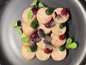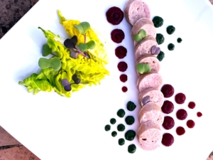 Les couper en tranches et les disposer sur les assiettes chauffées. Ajouter des points de purée en alternant les couleurs.
