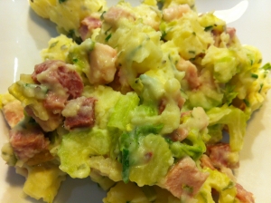En coupant les morceaux de pommes de terre, de céleri et de jambon en tout petit … on peut proposer cette salade dans des verrines pour un apéritif dînatoire par exemple.