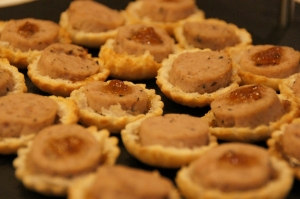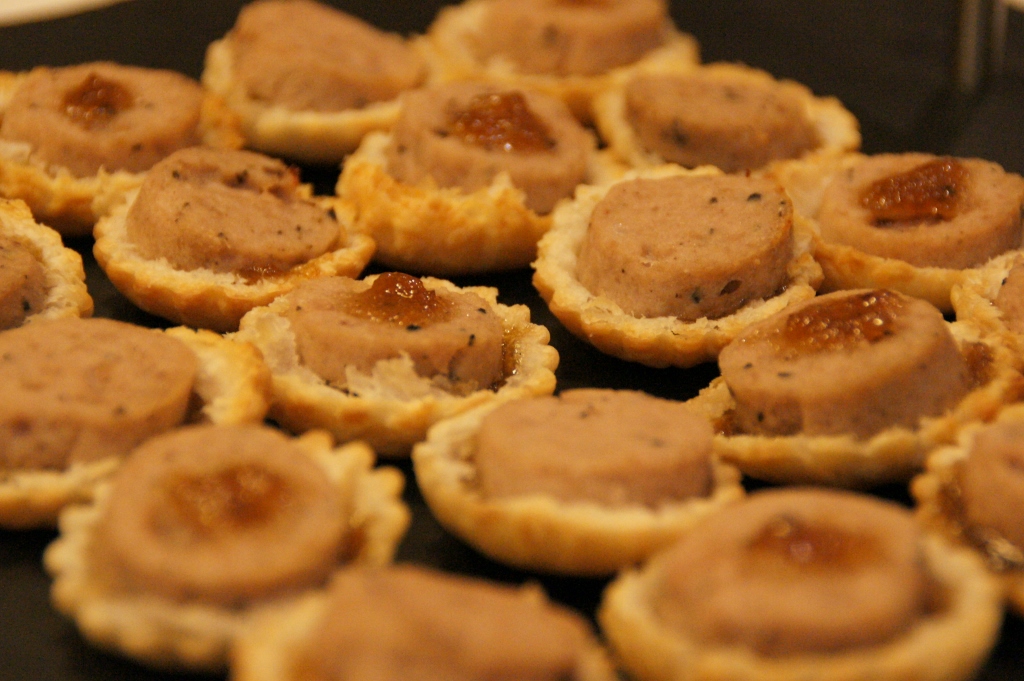 SONY DSC Pour une trentaine de tartelettes en pâte feuilletée, prévoir 2 à 3 boudins blancs, et une cinquantaine de grammes de confit d’oignons. Enfourner les tartelettes vides dans un four préchauffé à 180° environ 5 ou 6 minutes. Pendant ce temps, ébouillanter les boudins blancs 3 ou 4 minutes juste le temps de les réchauffer. Les égoutter, retirer le boyau du boudin, le couper en tranches d’environ 5 mn d’épaisseur. Dans les tartelettes chaudes, déposer une minuscule noix de confit d’oignons, la couvrir d’une tranche de boudin. Quand toutes les tartelettes sont remplies, les enfourner à nouveau 4 à 5 minutes juste avant de servir pour garantir des bouchées chaudes.