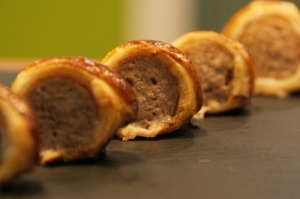 Pour une douzaine de bouchées, prendre 2 boudins blancs et de la pâte feuilletée. Préchauffer le four à 200° C Retirer le boyau des boudins et les enrouler de pâte feuilletée. Humecter d’eau la partie ou les 2 côtés de la pâte doivent se coller. Dorer ces « boudins de pâte » au jaune d’œuf. Découper des tronçons d’un gros centimètre et les installer verticalement sur la plaque du four préalablement recouverte d’un papier de cuisson. Enfourner pour 10 petites minutes, et servir chaud.