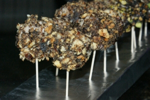 Enlever la peau des boudins blancs et les couper en rondelles d’environ 5 mn d’épaisseur. Les fariner légèrement. Faire griller séparément les noisettes et les pistaches à sec. Les concasser grossièrement et les mettre dans 2 petits bols séparés. Battre légèrement les blancs d’œuf et y tremper les rondelles de boudin blanc farinées. Puis les panner soit de « poudre »de  noisettes soit  « poudre » de pistaches et les déposer sur un papier sulfurisé  beurré et les laisser reposer au frais environ 30 minutes. Faire préchauffer le four à 210 ° C, enfourner les rondelles de boudin après les avoir arrosées d’un très léger filet d’huile d’olive, et les laisser chauffer environ 10 minutes. A la sortie du four, les installer sur des piques en bois pour en faire de jolies sucettes apéritives. Présenter joliment en les plantant sur une plaque de polystyrène décorée, et servir chaud, c’est meilleur que froid :-)