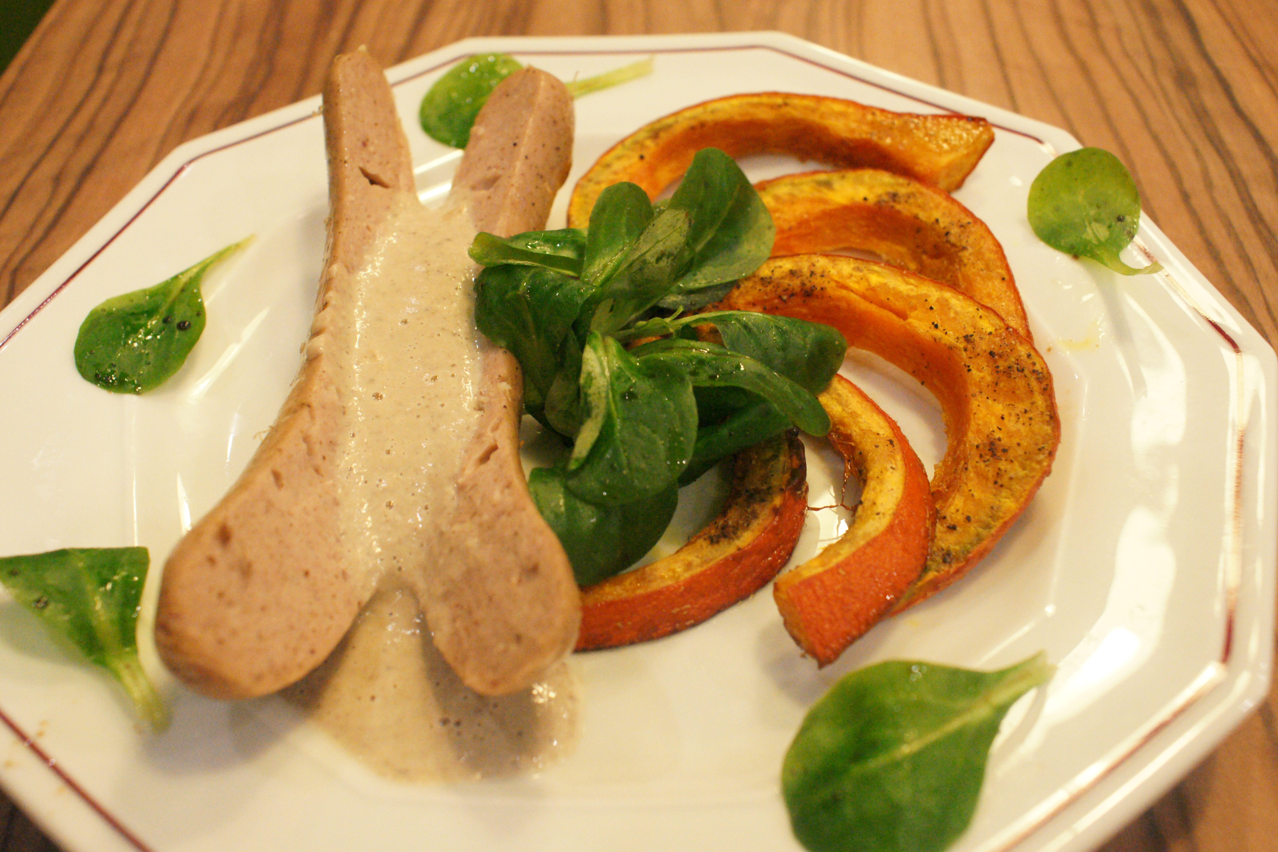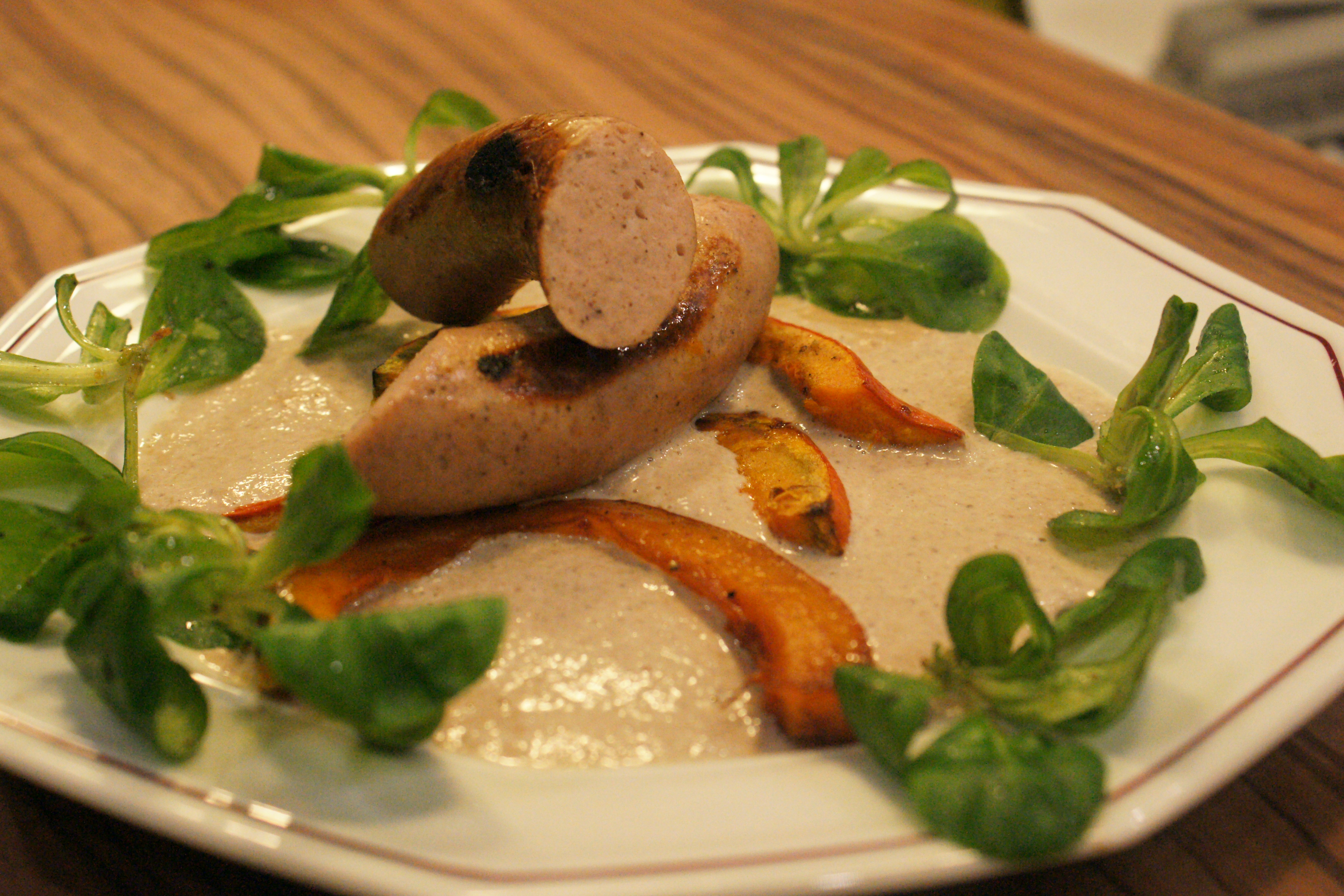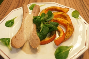 Couper les potimarrons en 2 dans le sens de la hauteur, les évider. Poser un demi-potimarron face vide contre la planche (assise aisée pour trancher) et couper des tranches d’environ 1 cm d’épaisseur (faire de même pour les 3 autres demi potimarrons). Les poser sur une plaque de four (préalablement recouverte d’un papier sulfurisé) les saler et poivrer et les recouvrir d’une petite rasade d’huile d’olive. Enfourner le tout 20 minutes dans un four préchauffé à 180° C.SONY DSC Faire suer les champignons émincés, y ajouter les châtaignes cuites, la crème et le lait et faire bouillir à petits bouillons, une dizaine de minutes. Mixer le tout le plus finement possible. (saler et poivrer selon votre goût) Préparer une petite salade de mâche avec une vinaigrette. Faire dorer les boudins blancs à feu doux sur une poêle environ 3 minutes de chaque côté. Disposer joliment dans les assiettes de service.