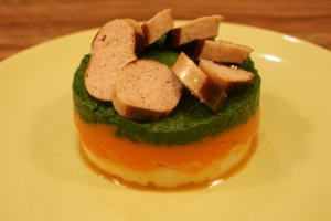 Une purée de pommes de terre bien assaisonnée de noix de muscade est superposée d’une purée de carottes juste salée et poivrée, puis une purée d’épinards, là aussi bien assaisonnée de noix de muscade. Le boudin blanc est poêlé pour lui donner une belle couleur dorée. Il suffit ensuite de monter le tout à l’aide d’un emporte pièce.