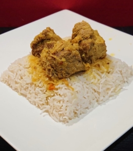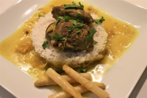 Servir avec du riz et ajouter quelques feuilles de coriandre fraîche aussi bien pour la fraîcheur que pour la couleur.