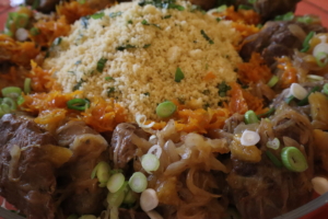 A la fin de cuisson des joues, faire cuire la graine de couscous comme indiqué sur le paquet. Cependant, avant de la mouiller d’eau bouillante salée, mettre une très belle pincée de piment d’Espelette afin de la parfumer. Quand la graine est cuite, je l’arrose d’une belle rasade d’huile d’olive (ou de beurre selon votre goût) puis je l’aère en la roulant entre mes mains. Ajouter le bouquet de basilic haché et la présenter au centre du plat.