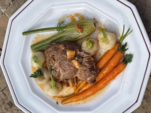 C’est parti pour 2 heures à 2.30 heures de cuisson. Pour l’assaisonnement en sel et poivre, attendez un peu car le fond de veau et le petit salé sont déjà très salés, donc gouttez à mi-cuisson le jus, et en fonction de votre goût vous ajouter du sel et du poivre, ou pas 🙂