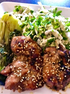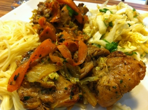 VARIANTE :  Pour faire le même genre de plat sans pâte, vous pouvez faire  cuire un chou pak choi (choux shangaï) . Lavez le, puis coupez le en deux dans le sens de la longueur. Mettre un peu d’huile dans une poêle avec une gousse d’ail hachée finement, puis faire cuire une quinzaine de minutes à couvert les 1/2 choux en les retournant à mi-cuisson. Les servir chaud avec les araignées cuites saupoudrées de quelques graines de sésame grillées, et la salade de choux chinois. Ce sera plus léger qu’avec les pâtes… et très bon aussi ! 🙂