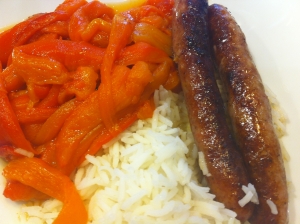 Égoutter les poivrons qui font beaucoup de jus, et servir les 3 ingrédients chauds et ensemble. Vous pouvez ajouter du poivre sur le riz si vous aimez les plats très épicés.