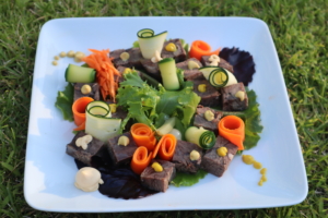 Couper les tranches de daube en dès, et installer tous les ingrédients à votre convenance.