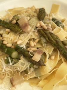 Ajouter les pâtes cuites dans le mélange guanciale/oignon/asperge cuit et mélanger avec tout le parmesan qu’il vous plaira.