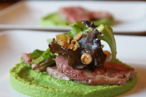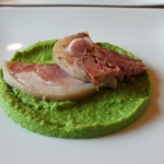 tranches dans chaque moitié qui auront donc des formes de demi lune. Dans un mixeur, mettre les petits pois cuits, le wasabi et mixer jusqu’à l’obtention d’une purée la plus lisse possible. Rectifier l’assaisonnement selon votre goût. Installer la purée dans des cercles de présentation pour obtenir un joli rond dans l’assiette. Mettre une poêle à chauffer avec un peu d’huile d’olive, snacker très rapidement les tranches de jarret et les disposer en « fleur » sur la purée. (attention si les tranches de jarret restent trop longtemps dans la poêle, elles se disloqueront !) Mélanger la salade à la vinaigrette et la déposer joliment sur « la fleur de jarret ». Servir immédiatement, pour que le jarret reste chaud/tiède !