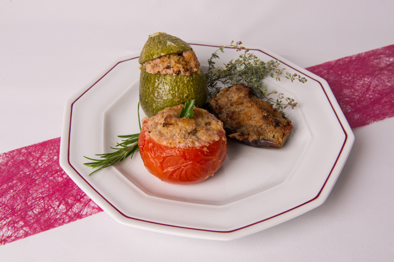 Il faut évider les tomates et autres légumes. On prépare une farce maison faite à base de chair à saucisse et de jambon blanc, une petite persillade on mélange le tout. On farcit chaque légume d’une farce un peu différente afin d’en varier les goûts.