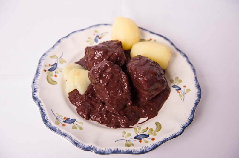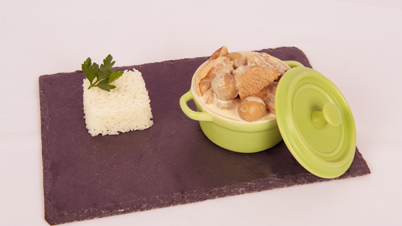 De l’épaule ou de la poitrine de veau qui mijote dans du vin blanc. Une sauce liée à la crème fraiche et quelques champignons , voilà la recette bien résumée, mais on garde quelques secrets de fabrication !