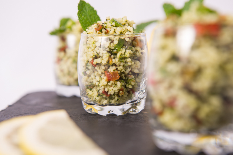 Des tomates, des poivrons rouges et verts coupés en mini brunoise, mélangés à de la semoule de blé dur, de la menthe et du persil à go-go aromatisent et apportent de la fraicheur, un peu de jus de citron et voilà le tour est joué !